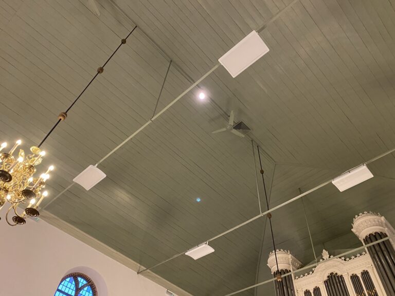 De Hervormde Gemeente Woudenberg verwarmt haar 16e-eeuwse dorpskerk met veertien Heatscreens van 2300W. De schermen zijn in wit uitgevoerd, zodat ze naadloos aansluiten bij het authentieke karakter van de kerk.